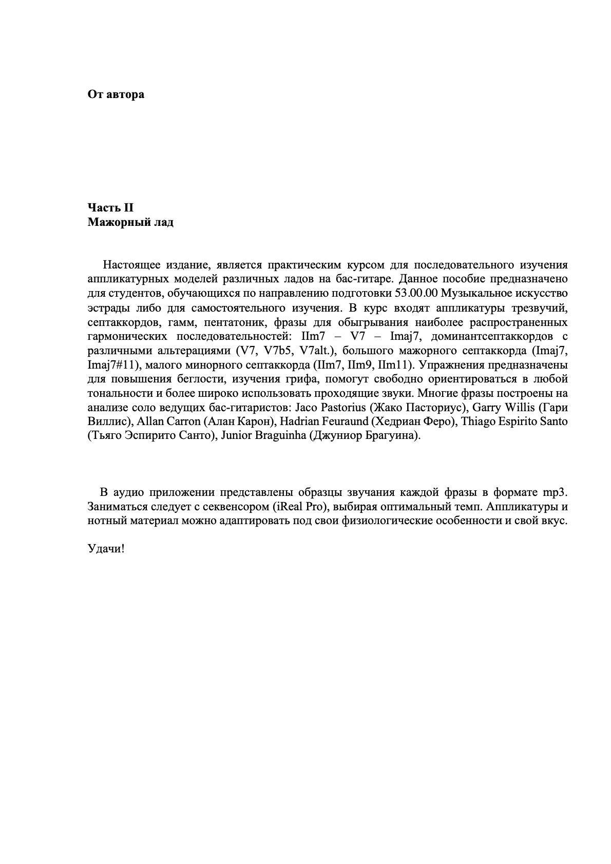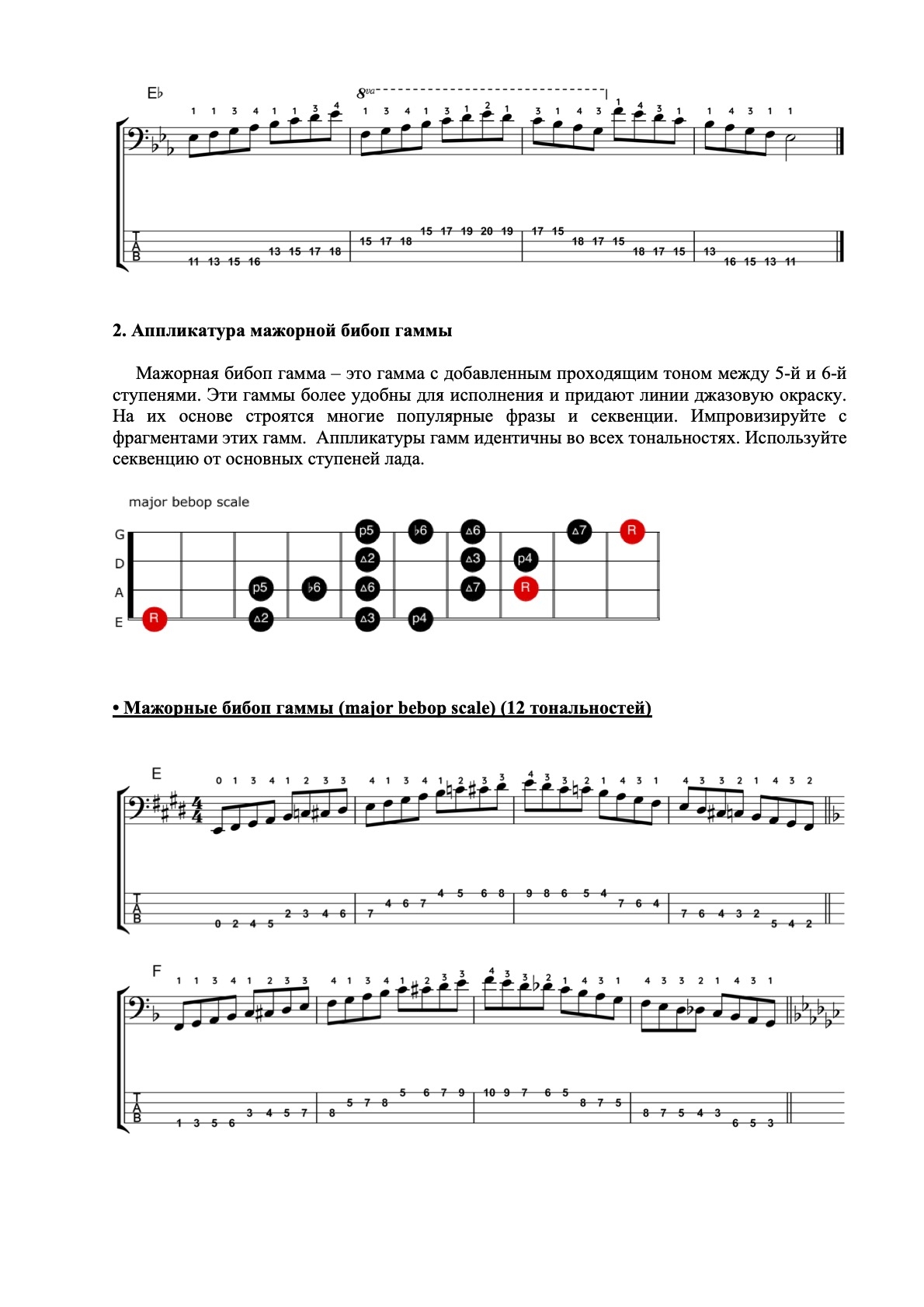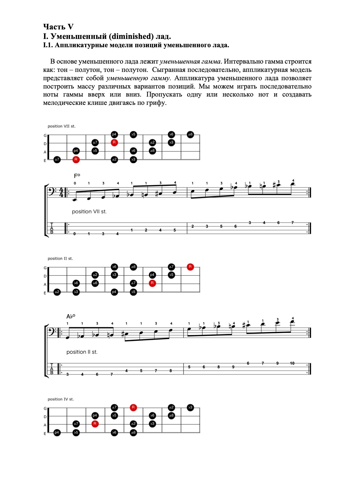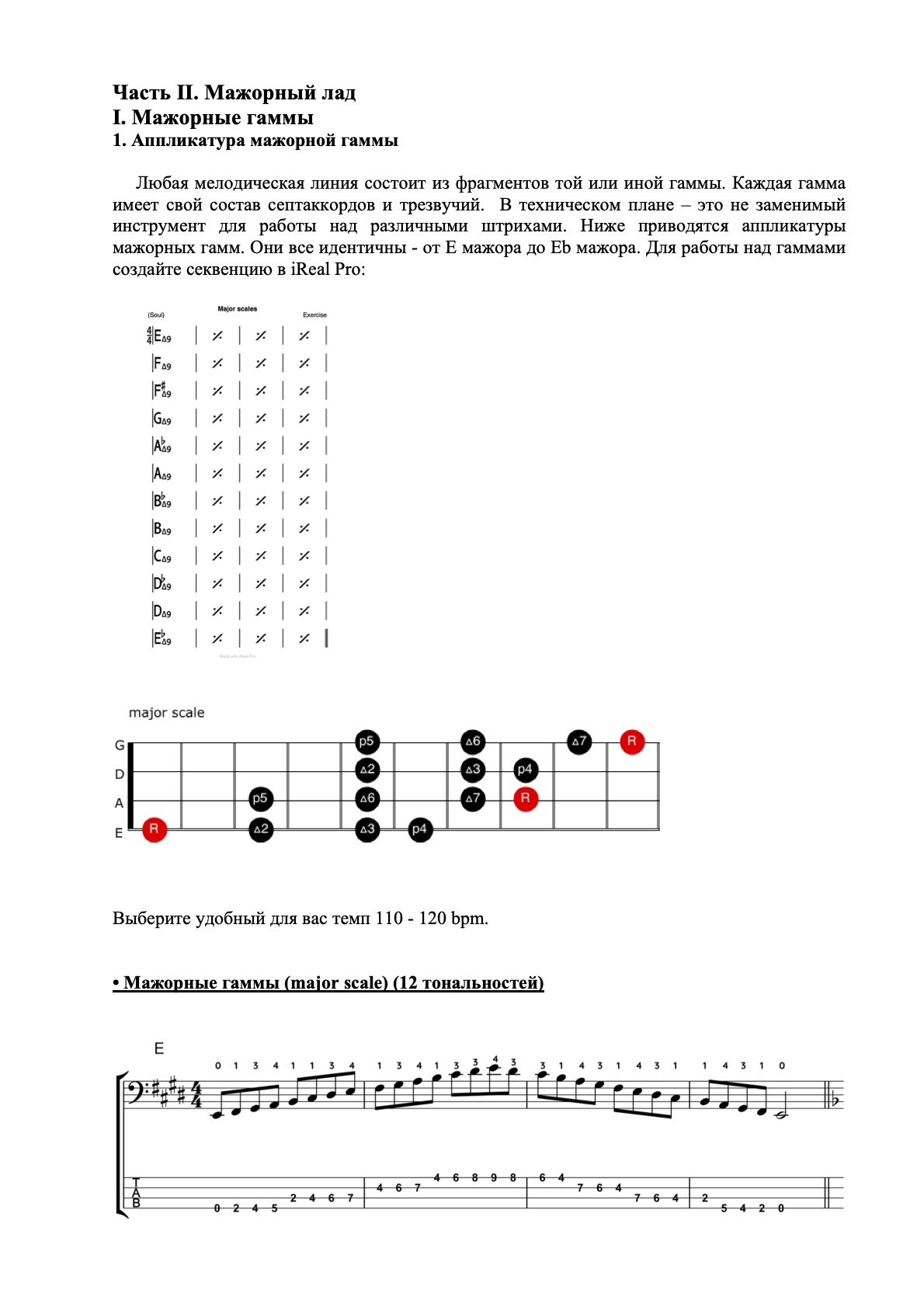 Перед Вами профессиональный набор учебных пособий для бас-гитары. Он представляет собой практический курс для последовательного изучения различных ладов и их аппликатурных моделей. В курс входят аппликатуры трезвучий, септаккордов, гамм, пентатоник, фразы для обыгрывания наиболее распространенных гармонических последовательностей: IIm7 – V7 – Imaj7, доминантсептаккордов с различными альтерациями (V7, V7b5, V7alt.), большого мажорного септаккорда (Imaj7, Imaj7#11), малого минорного септаккорда (IIm7, IIm9, IIm11). Упражнения предназначены для повышения беглости, изучения грифа, помогут свободно ориентироваться в любой тональности и более широко использовать проходящие звуки.